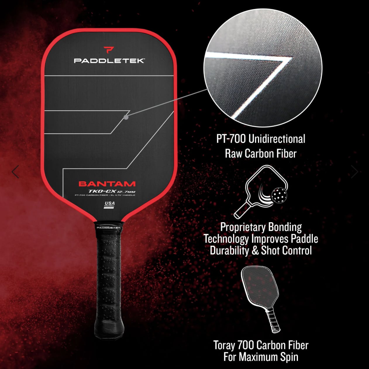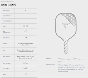トップピックルボールのプロであるChristian Alshonと共同で設計され、パワー、スピン、リーチの組み合わせを提供します。PT-700単方向RAWカーボンファイバーは、伝説的な12.7mmバンタムコアと組み合わせて、本格的なプレーヤーに最大のパワーとスピン能力を提供します。5 3⁄4インチのハンドルは風の抵抗を減らし、両手のバックハンドを可能にします。一方、全体のパドルの長さは16 1⁄2インチで接触点での速度を上げ、ヒットするたびに指数関数的にパワーが増加します。