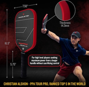 トップピックルボールのプロであるChristian Alshonと共同で設計され、パワー、スピン、リーチの組み合わせを提供します。PT-700単方向生炭素繊維は、より寛容な14.3mmバンタムコアと組み合わされ、本格的なプレーヤーに制御可能なパワーとスピン能力を提供します。5 3⁄4インチのハンドルは風の抵抗を減らし、両手のバックハンドを可能にします。一方、全体のパドルの長さは16 1⁄2インチで接触点での速度を上げ、ヒットするたびに指数関数的にパワーが増加します。