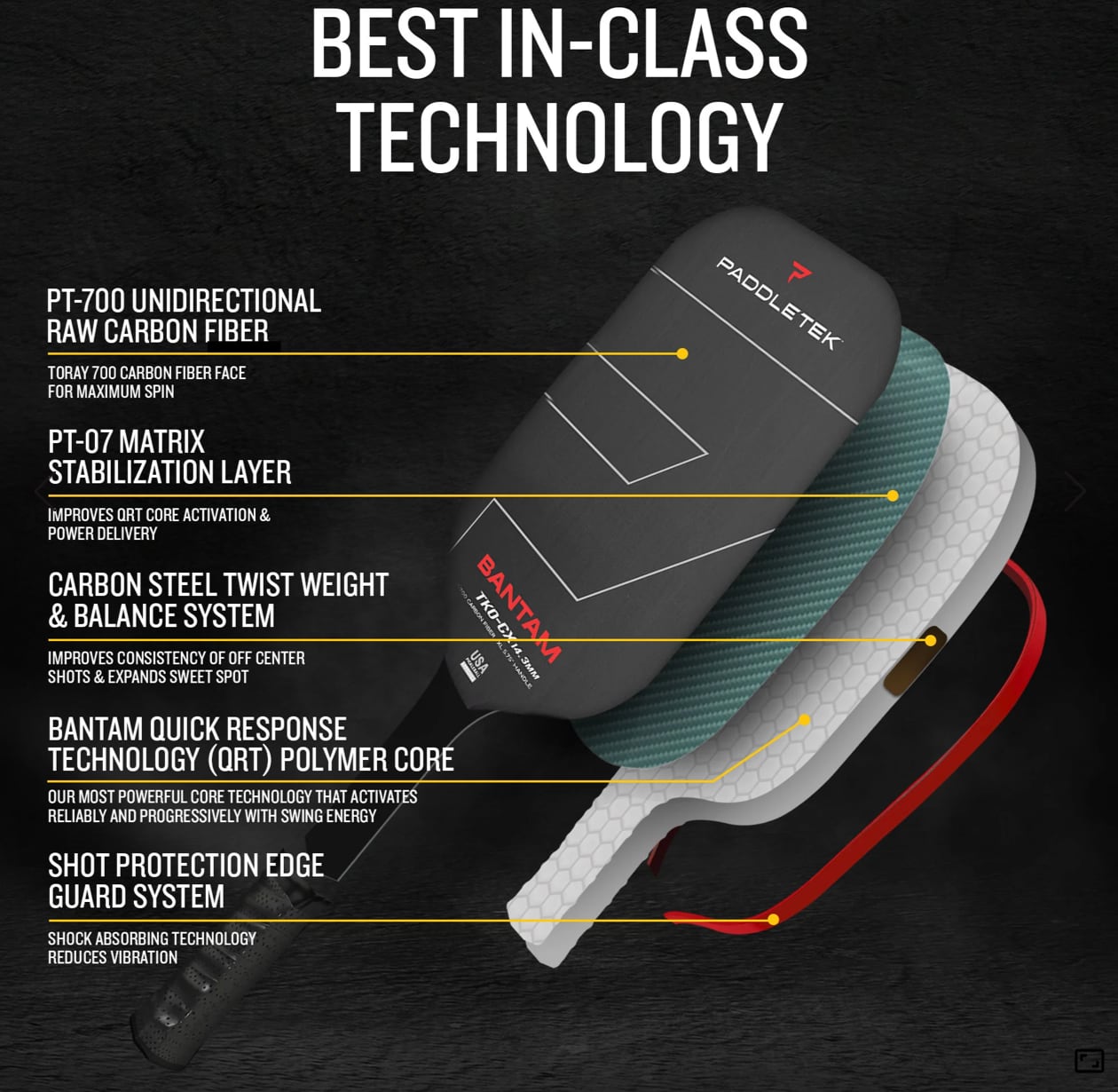 トップピックルボールのプロであるChristian Alshonと共同で設計され、パワー、スピン、リーチの組み合わせを提供します。PT-700単方向生炭素繊維は、より寛容な14.3mmバンタムコアと組み合わされ、本格的なプレーヤーに制御可能なパワーとスピン能力を提供します。5 3⁄4インチのハンドルは風の抵抗を減らし、両手のバックハンドを可能にします。一方、全体のパドルの長さは16 1⁄2インチで接触点での速度を上げ、ヒットするたびに指数関数的にパワーが増加します。