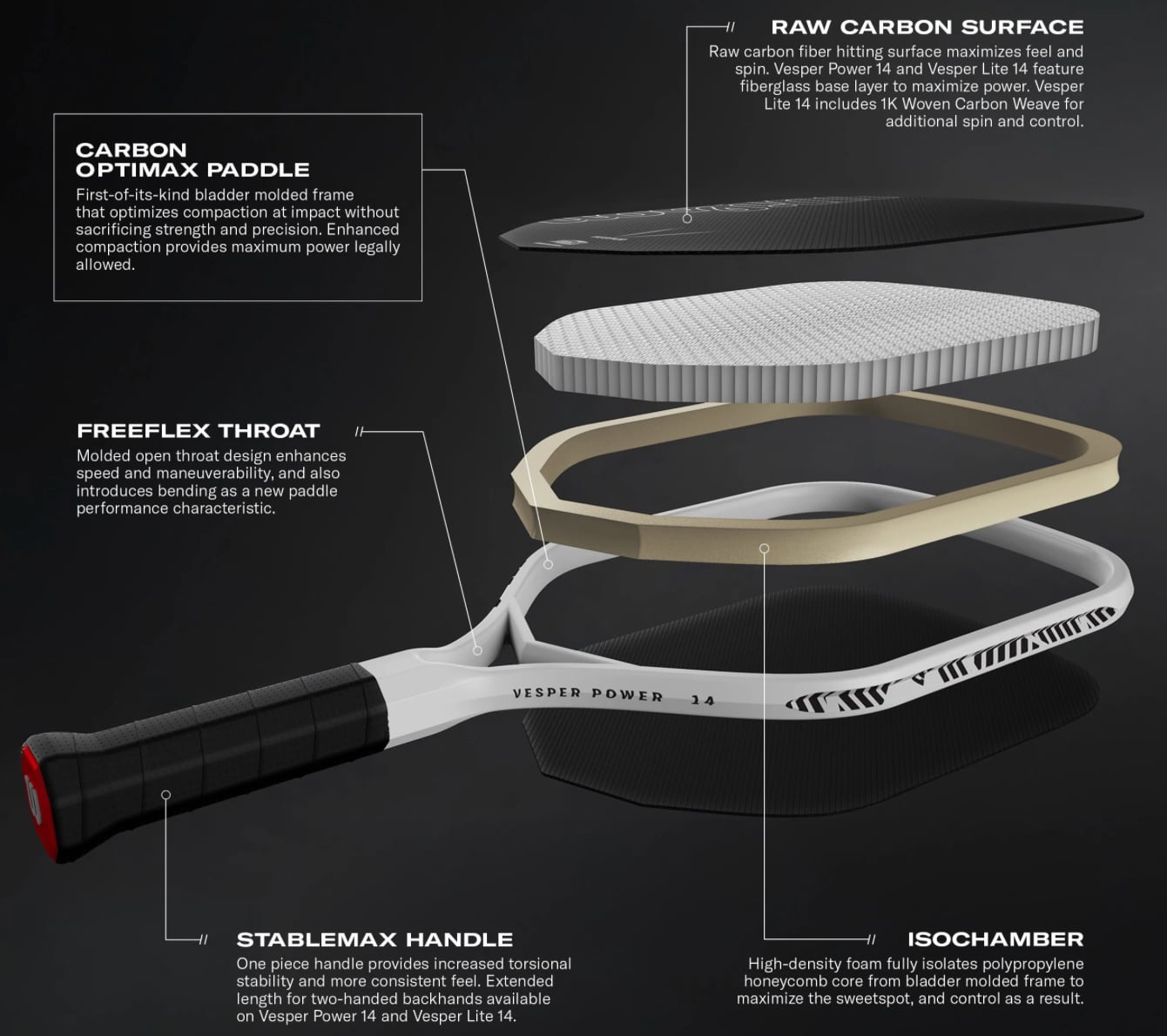 伝統的なパドルの概念を消し去る、革新的な構造がVESPER。オープンスロートにする事に空気抵抗を軽減し、スウィングスピードアップが望め、またパドルにしなりが生まれラケットスポーツの本来の楽しさを生み出します。