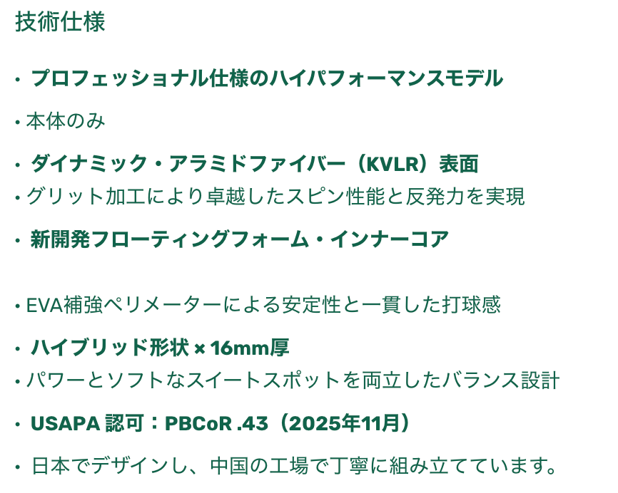 EVERYDAY SOCIAL® ピックルボールパドルの最高到達点を体現するモデルです。新開発の“フローティング・フォームコア”と EVA 強化フレームを採用し、パワー・安定性・タッチフィールのすべてを高次元でバランスよく実現しました。