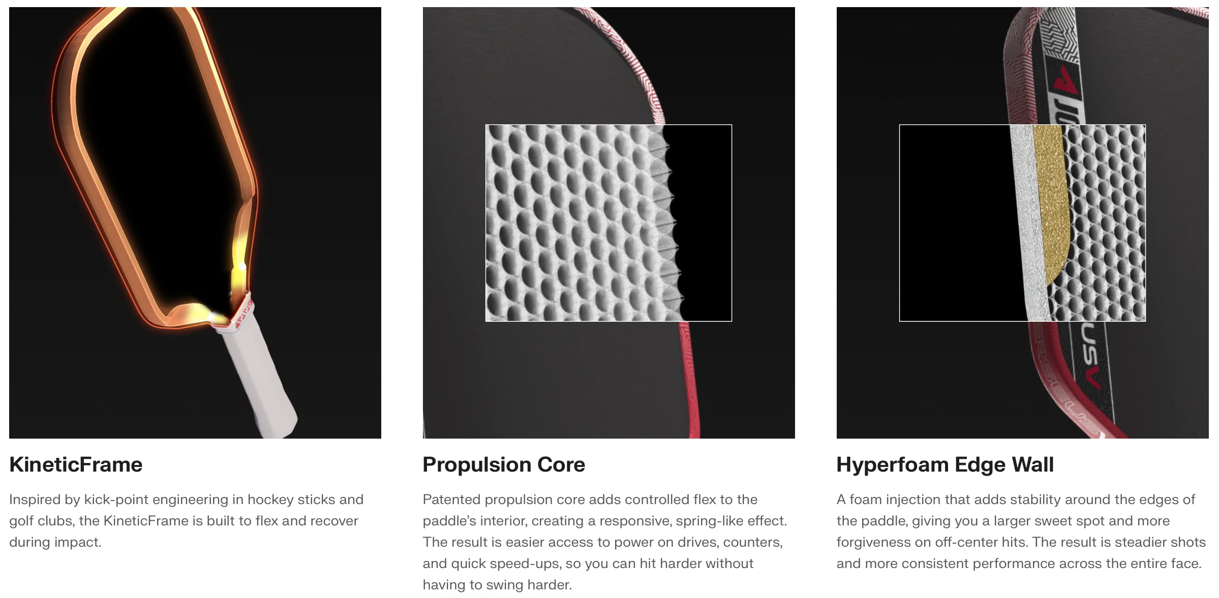 JOOLAの特許出願中のKineticFrameは、パドルの喉部に統合されており、よりスリムなフレームが作られ、勢いを蓄えるために屈曲し、衝撃で放出してボール配置を改善します。
