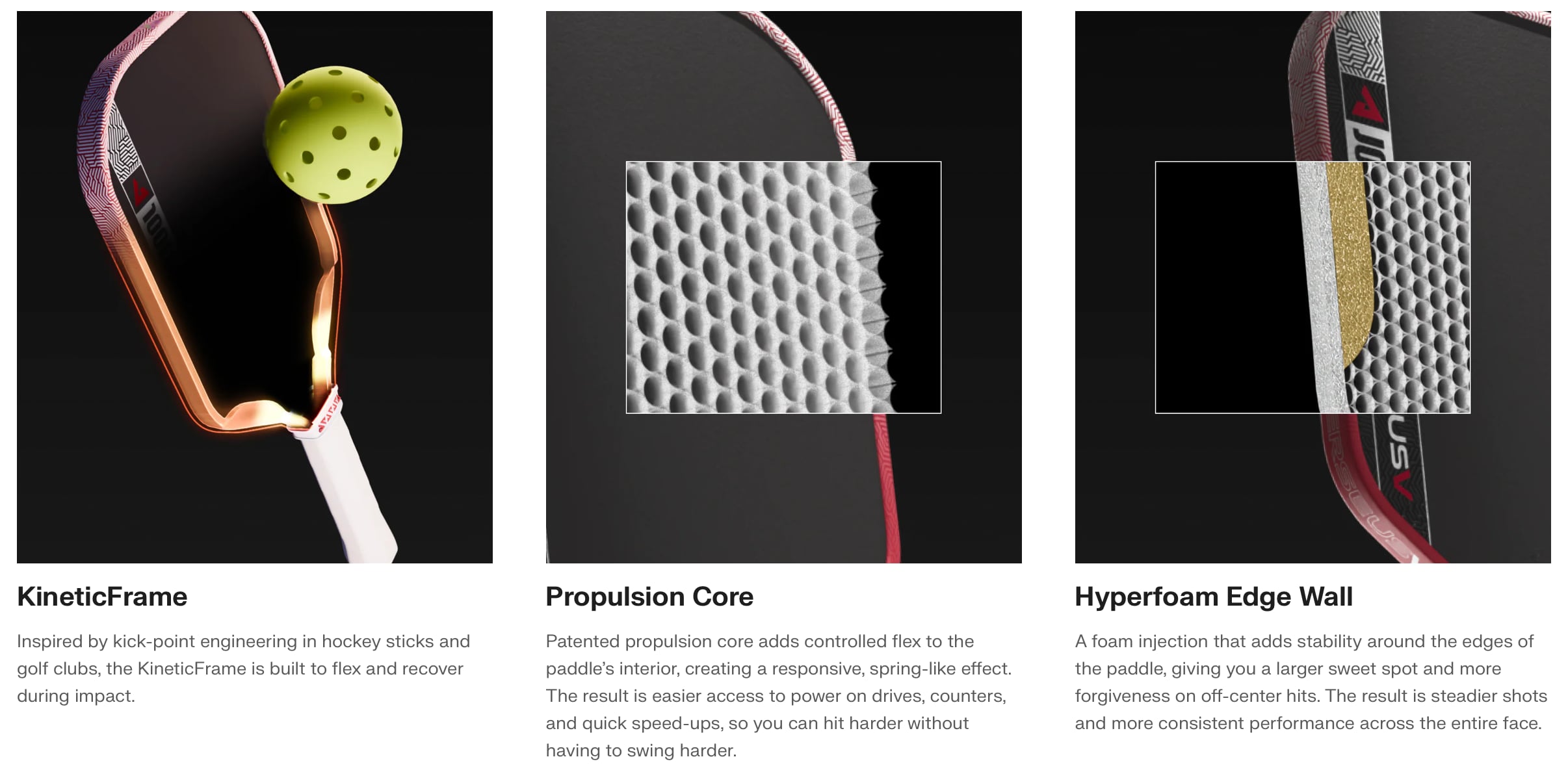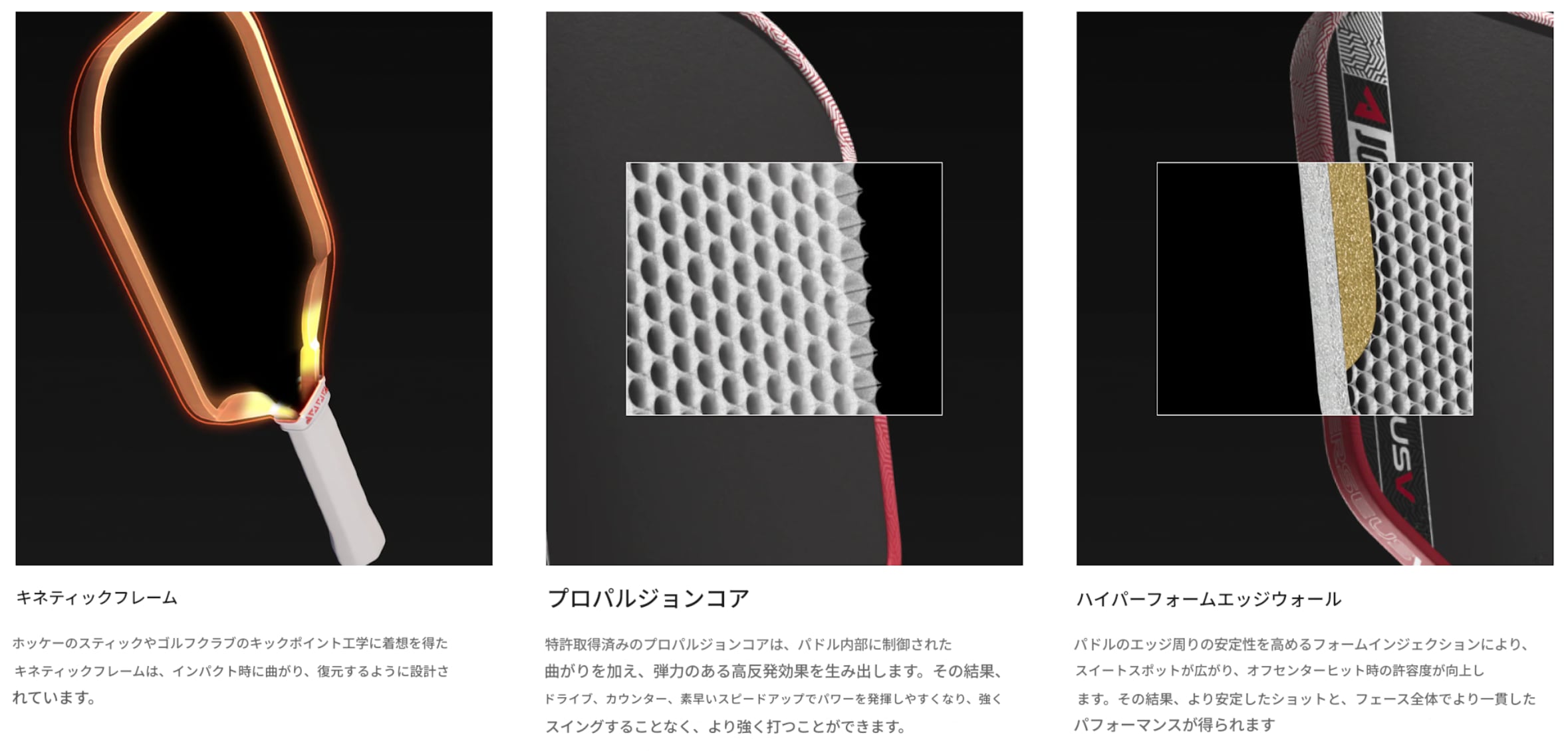 JOOLAの特許出願中のKineticFrameは、パドルの喉部に統合されており、よりスリムなフレームが作られ、勢いを蓄えるために屈曲し、衝撃で放出してボール配置を改善します。