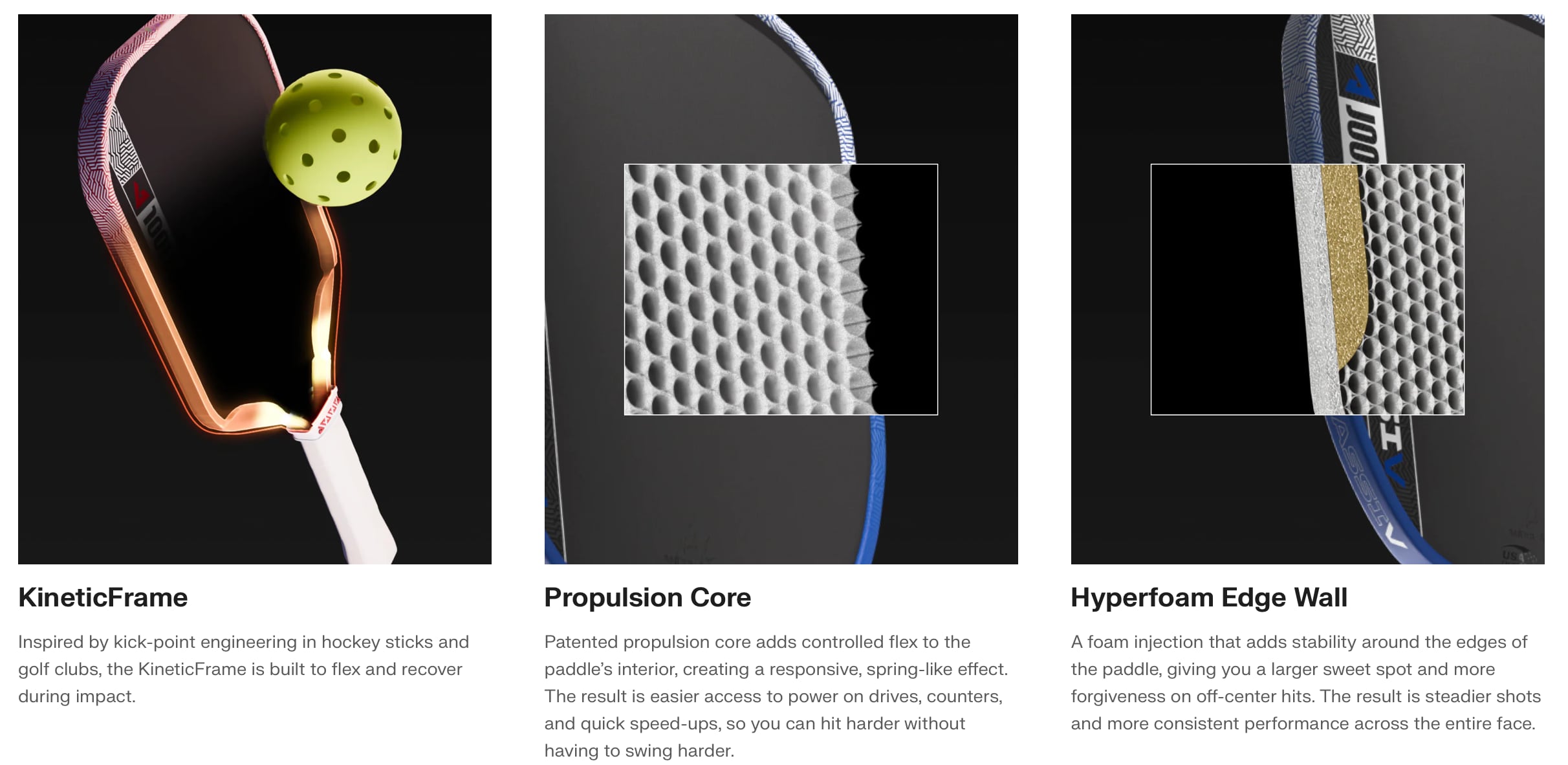 JOOLAの特許出願中のKineticFrameは、パドルの喉部に統合されており、よりスリムなフレームが作られ、勢いを蓄えるために屈曲し、衝撃で放出してボール配置を改善します。