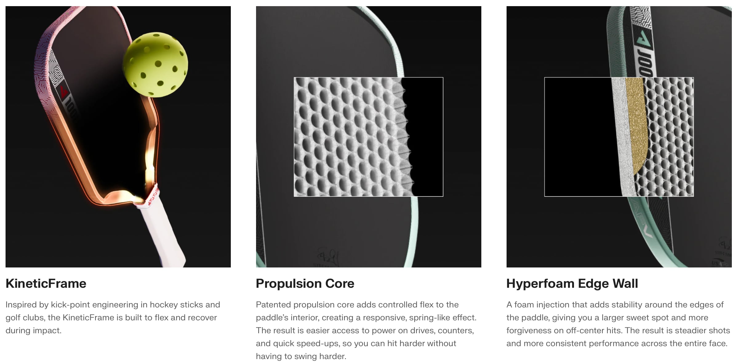 JOOLAの特許出願中のKineticFrameは、パドルの喉部に統合されており、よりスリムなフレームが作られ、勢いを蓄えるために屈曲し、衝撃で放出してボール配置を改善します。
