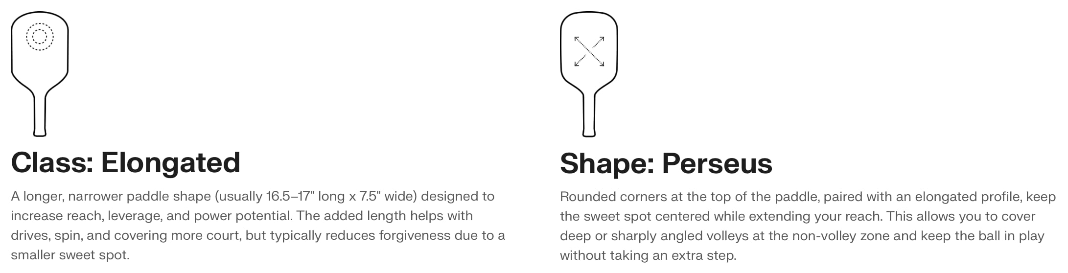 パドル上部の丸みを帯びたコーナーと細長いプロファイルを組み合わせることで、スイートスポットを中央に保ちつつリーチを拡張し、ノンボレーゾーンで深いまたは鋭角のボレーをカバーし、余分なステップを踏むことなくボールをプレー中に保ちます。