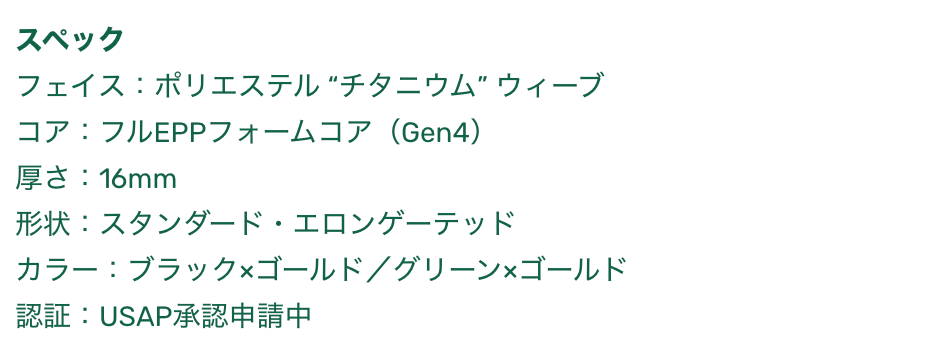 コアには16mmのフローティング構造(EPPフォーム)を採用。重要なポイントでエネルギーを吸収し、効率よく反発へと変換することで、ドライブ、リセット、スマッシュのすべてにおいて優れた弾き(ポップ)を生み出します。仕上げはシグネチャーのブラック、またはグリーンにゴールドのアクセント。パフォーマンスと同様に、美しさにも妥協しないデザインです。
